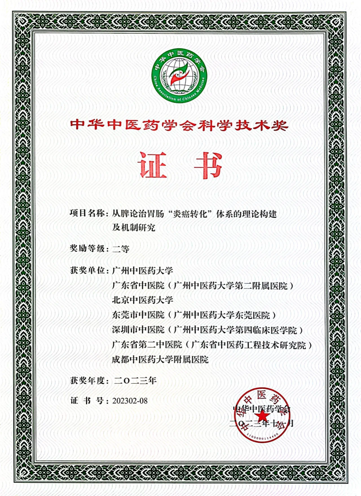 中华中医药学会科学技术奖二等奖
