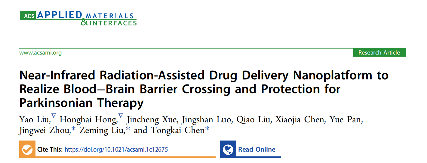 7. Yao Liu, Honghai Hong, Jincheng Xue, Jingshan Luo, Qiao Liu, Xiaojia Chen, Yue Pan, Jingwei Zhou, Zeming Liu, Tongkai Chen*. Near-infrared radiation-assisted drug delivery nanoplatform to realize blood-brain barrier crossing and protection for Parkinsonian therapy. ACS Applied Materials & Interfaces, 2021, 13: 37746-37760. (中科院一区,IF:10.383)