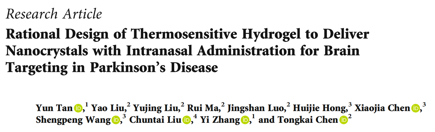 6. Yun Tan, Yao Liu, Yujing Liu, Rui Ma, Jingshan Luo, Huijie Hong, Xiaojia Chen, Shengpeng Wang, Yi Zhang, Tongkai Chen*. Rational design of thermosensitive hydrogel to deliver nanocrystals with intranasal administration for brain targeting in Parkinson's disease. Research, 2021, 2021: 9812523. (中科院一区,IF:11.036)