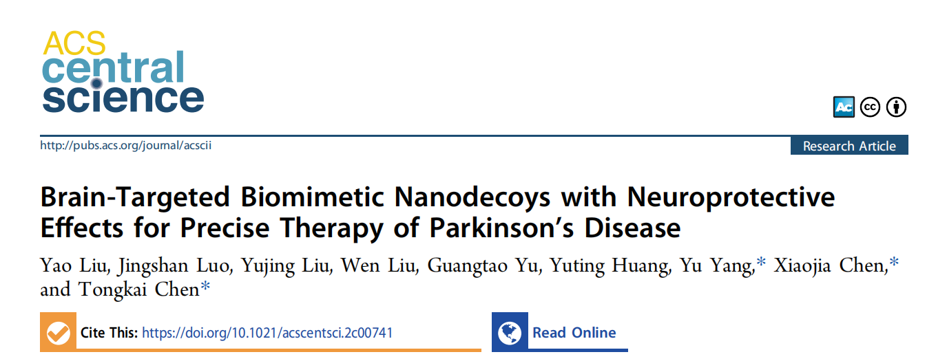 2. Yao Liu, Jingshan Luo, Yujing Liu, Wen Liu, Guangtao Yu, Yuting Huang, Yu Yang, Xiaojia Chen, Tongkai Chen*. Brain-Targeted Biomimetic Nanodecoys with Neuroprotective Effects for Precise Therapy of Parkinson’s Disease. ACS Central Science, 2022, 8: 1336-1349. (中科院一区,IF:18.728)