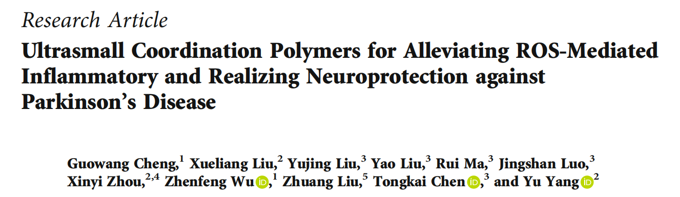3. Guowang Cheng, Xueliang Liu, Yujing Liu, Yao Liu, Rui Ma, Jingshan Luo, Xinyi Zhou, Zhenfeng Wu, Zhuang Liu, Tongkai Chen*, Yu Yang. Ultrasmall Coordination Polymers for Alleviating ROS-Mediated Inflammatory and Realizing Neuroprotection against Parkinson’s Disease. Research, 2022, 2022: 9781323. (中科院一区,IF:11.036)