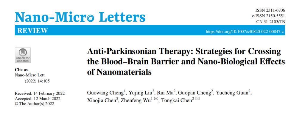 1. Guowang Cheng, Yujing Liu, Rui Ma, Guopan Cheng, Yucheng Guan, Xiaojia Chen, Zhenfeng Wu, Tongkai Chen*. Anti-Parkinsonian therapy: Strategies for crossing the blood-brain barrier and nano-biological effects of nanomaterials. Nano-Micro Letters, 2022, 14:105. (中科院一区,IF:23.655)