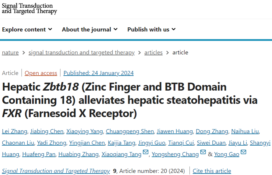 1月24日,广州中医药大学437ccm·必赢国际高永、四川大学唐小强及天津医科大学常永生共同通讯在Signal Transduction and Targeted Therapy(IF=39)在线发表题为“Hepatic Zbtb18 (Zinc Finger and BTB Domain Containing 18) alleviates hepatic steatohepatitis via FXR (Farnesoid X Receptor)”的研究论文。