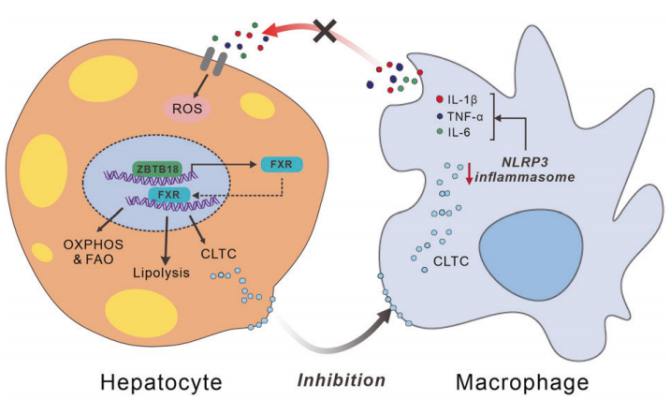 Zbtb18基因编码C2H2型锌指蛋白,并共享保守POK (POZ和 Krüppel)/BTB结构域亚类。先前的报道显示Zbtb18与CtBP2 (c -末端结合蛋白2)基因相互作用,促进胶质母细胞瘤的恶性进展。最近的研究还表明,Zbtb18抑制与非神经元细胞身份和胶质母细胞瘤亚型密切相关的转录程序,参与神经发育疾病。然而,Zbtb18是否参与肝脏糖脂代谢尚不清楚。该研究发现肝脏Zbtb18可以激活FXR转录,从而加速肝脏FAO,从而阻止NAFLD的发生和发展。此外,Zbtb18/FXR轴刺激的CLTC蛋白表达显著抑制NLRP3炎性小体的活性,减轻肝脏炎症浸润和肝纤维化。因此,Zbtb18/FXR轴代表了治疗NAFLD和NASH的一个新的候选靶点。