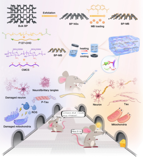 阿尔茨海默病(AD)的标志性病理特征之一为过度磷酸化的 Tau 蛋白(p-Tau)聚集形成的神经纤维缠结,导致线粒体功能障碍和活性氧簇的过量产生。因此,抑制p-Tau聚集,逆转线粒体功能障碍,进而减轻氧化应激,保护神经元,改善AD症状。然而,由于血脑屏障的存在和AD复杂的病理,使AD的治疗困难重重。鼻腔给药是一种有效绕过血脑屏障并将药物输送到大脑的给药方式。基于此,该课题组研发了一种温敏水凝胶用于鼻腔递药治疗AD。首先,羧甲基壳聚糖(CMCS)和醛基修饰的Pluronic F127(F127-CHO)通过席夫碱反应形成动态共价交联的水凝胶,随后,原位负载药物纳米复合物,得到BP-MB@Gel。这种定制的水凝胶在初始液态时易于鼻腔注射,在体温刺激下转变为凝胶状态,从而在鼻腔粘膜中形成药物储库,持续释放药物递送入脑。通过抑制p-Tau聚集,逆转线粒体功能障碍,进而减轻氧化应激,改善AD的认知功能障碍。这种多管齐下的治疗策略,克服了血脑屏障的挑战,防止了药物在鼻腔内的快速流失,为AD治疗提供了一种潜在的靶向药物递送思路。