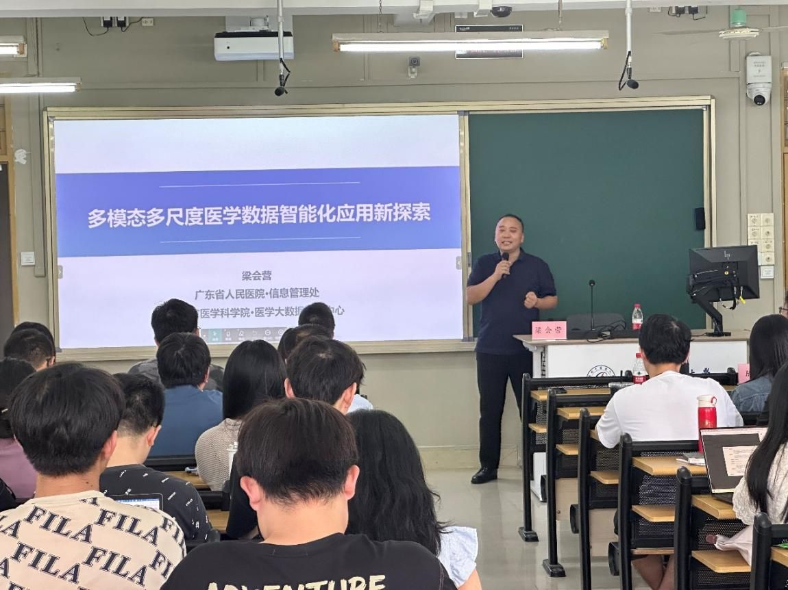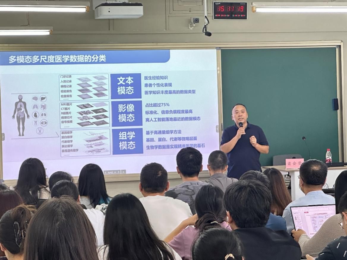 梁教授首先从医学数据的概念出发,向我们清晰展示了医学数据从提供方到需求方的流通规范,让我们对医学数据的运用有了一个直观的了解。随后,梁教授以医学数据多模态多尺度的特性为切入点,向我们着重介绍了医学数据的文本模态和影像模态这两大分类,并且深入分析了这两大分类的特征、临床数据的获取收集方式以及处理方法。在梁教授深入浅出地的阐述下,在座师生对复杂医学数据的处理与利用有了更为清晰的认识。通过生动的案例分享,梁教授展示了“多模态医学数据”在临床实践中的广泛应用及“医学人工智能”领域的最新成果,激发了与会者浓厚的兴趣和深刻的思考。