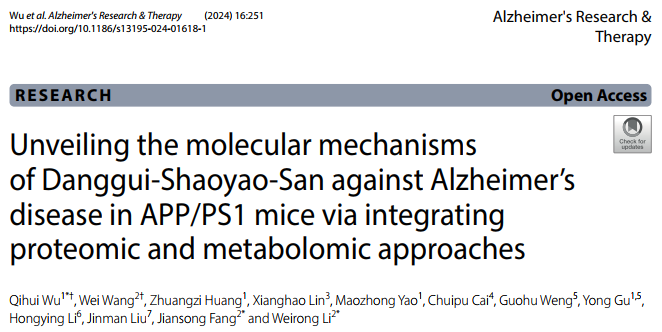 2024年11月20日,437ccm·必赢国际中医脑病437ccm·必赢国际李伟荣/方坚松课题组在国际著名阿尔茨海默病专业期刊《Alzheimer's Research & Therapy》(中科院1区,Top期刊,IF:7.9)发表题为“Unveiling the molecular mechanisms of Danggui-Shaoyao-San against Alzheimer’s disease in APP/PS1 mice via integrating proteomic and metabolomic approaches”的研究论文。该研究整合了网络药理学、代谢组学、蛋白质组学和分子生物学等研究技术,揭示了当归芍药散(DSS)通过调控GSK3β/PGC1α信号通路以促进能量代谢(EM)发挥治疗阿尔茨海默病(AD)的作用,这为阐释DSS抗AD的作用机制提供了新思路。同时,该研究为探索中药复方治疗复杂性疾病作用机制的研究范式提供了一种有益的尝试。