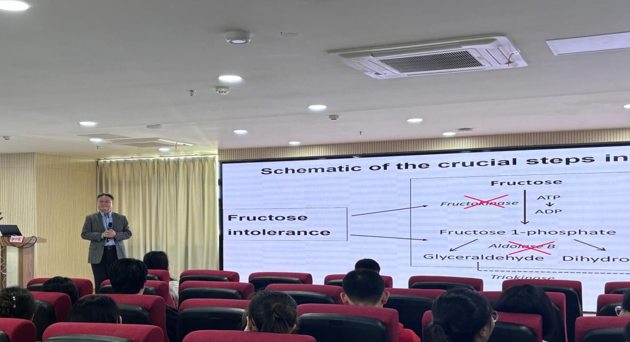 李教授详细阐述了果糖在体内的代谢过程,他以图表的形式清晰展示了果糖的代谢途径,并强调了在果糖不耐受情况下可能受到影响的关键代谢步骤,帮助大家理解了果糖不耐受的生化机制。随后,李教授深入剖析了果糖诱导盐敏感性高血压的具体机制,他从肾脏血流动力学的改变入手,逐步剖析了氧化应激和炎症反应在肾脏乃至全身循环系统中对血压调节机制的破坏,为同学们揭示了这一复杂病理过程的奥秘。此外,李教授还以问答的方式与大家进行了深入探讨,大大激发了与会者的思维活力,为后续相关领域的研究和实践应用提供了思路。