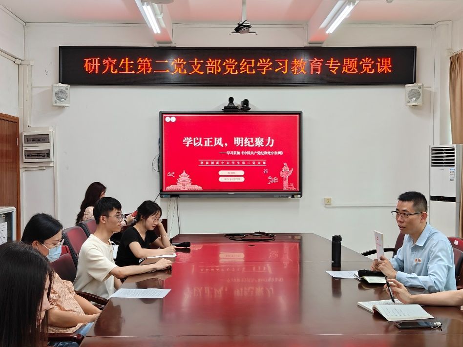 6月27日下午,437ccm·必赢国际研究生第二党支部书记陈桐楷以《学以正风,明纪聚力》为题,为党员同志讲授专题党课,深入开展党纪学习教育。